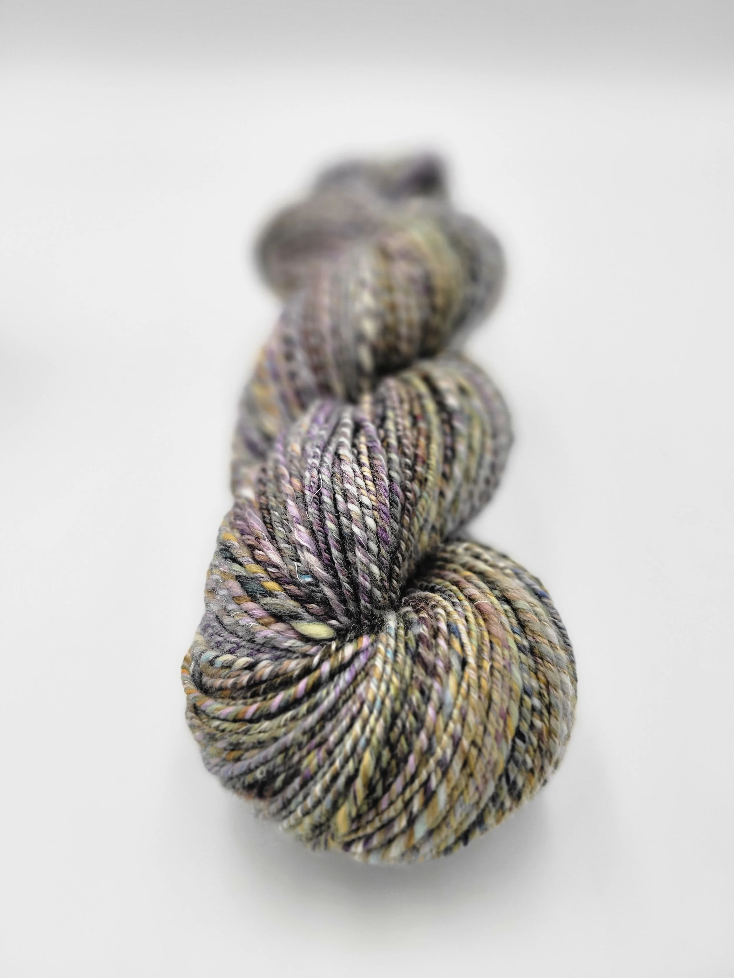 And here are the finished singles and yarn. Singles were spun with my default backward draft on my Lendrum with an 8:1 ratio. I plied the singles “through the rings”, as Kim recommends, using the metalwork on the back of a stool. This really helped keep them separate and smooth. I typically ply standing to break up all that sitting with my EEW electric wheel on the kitchen bar at arm level. I’ve not been getting along well with this wheel lately so I might reconsider this plying set up. I’m struggling with the take up of the yarn, the speed of the ply, the machine migrating around, all of it. It’s just gotten worse over time too. It’s probably me but, if a tool’s not working and I can’t fix why that is, it might be time to move on.