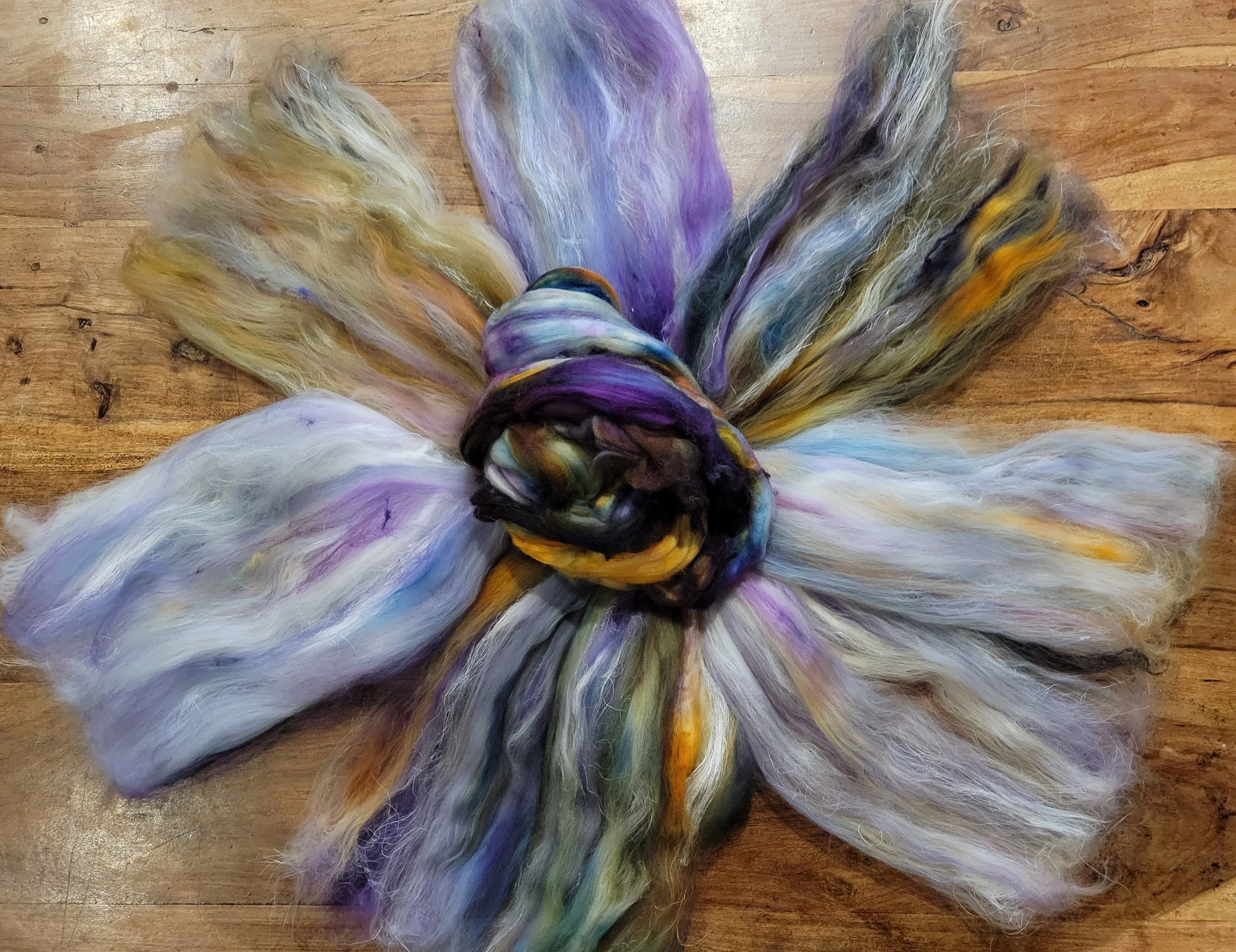 Taking each batt to the hand card and blending the fiber again before dizzing into tiny nests of colour, pictured below.