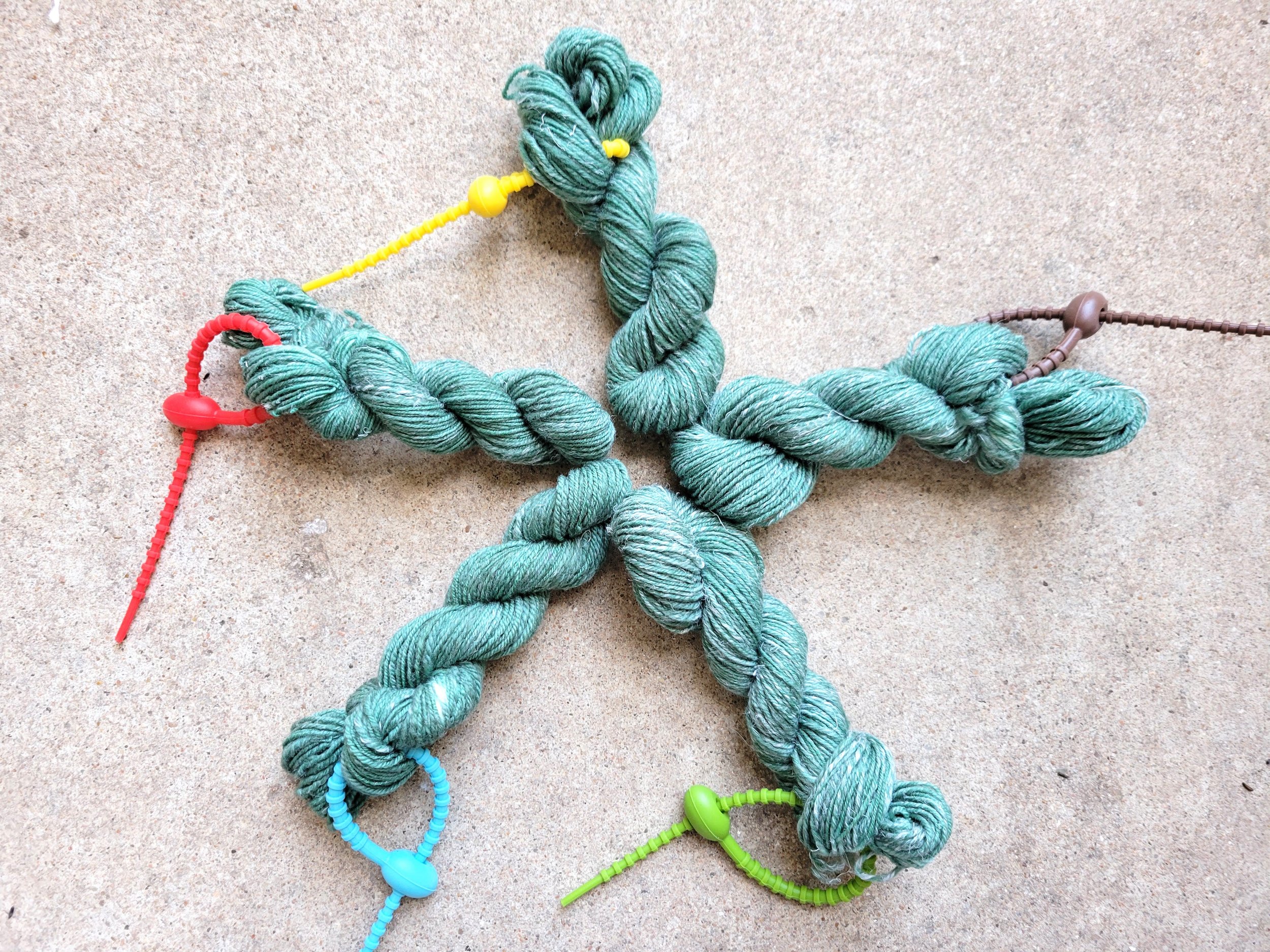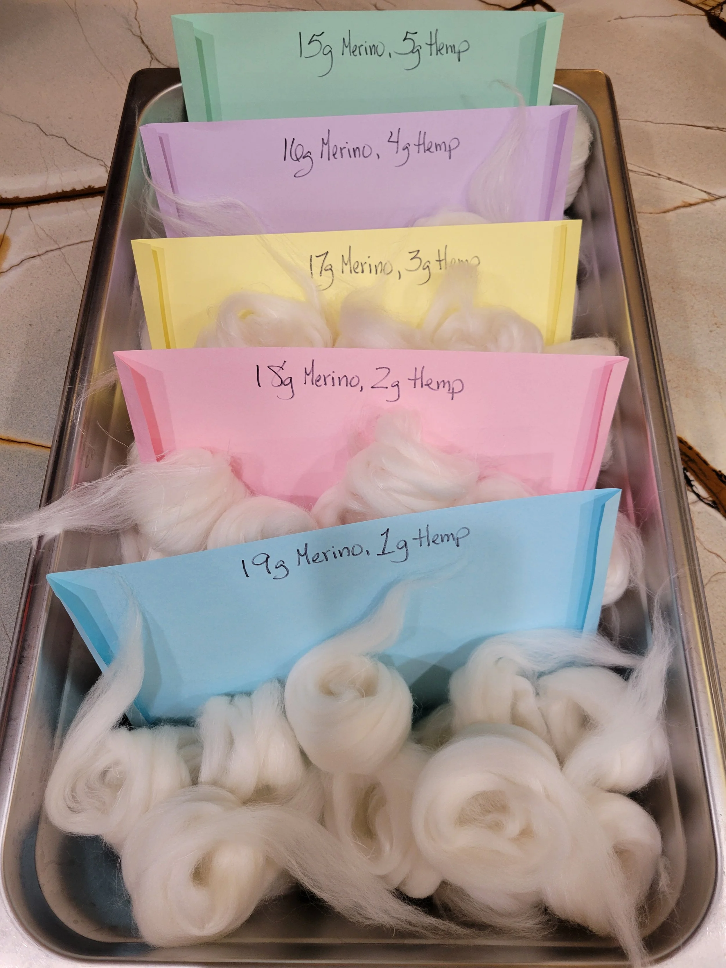 Clockwise from blue to green are the final skeins with 1g through 5g of hemp.