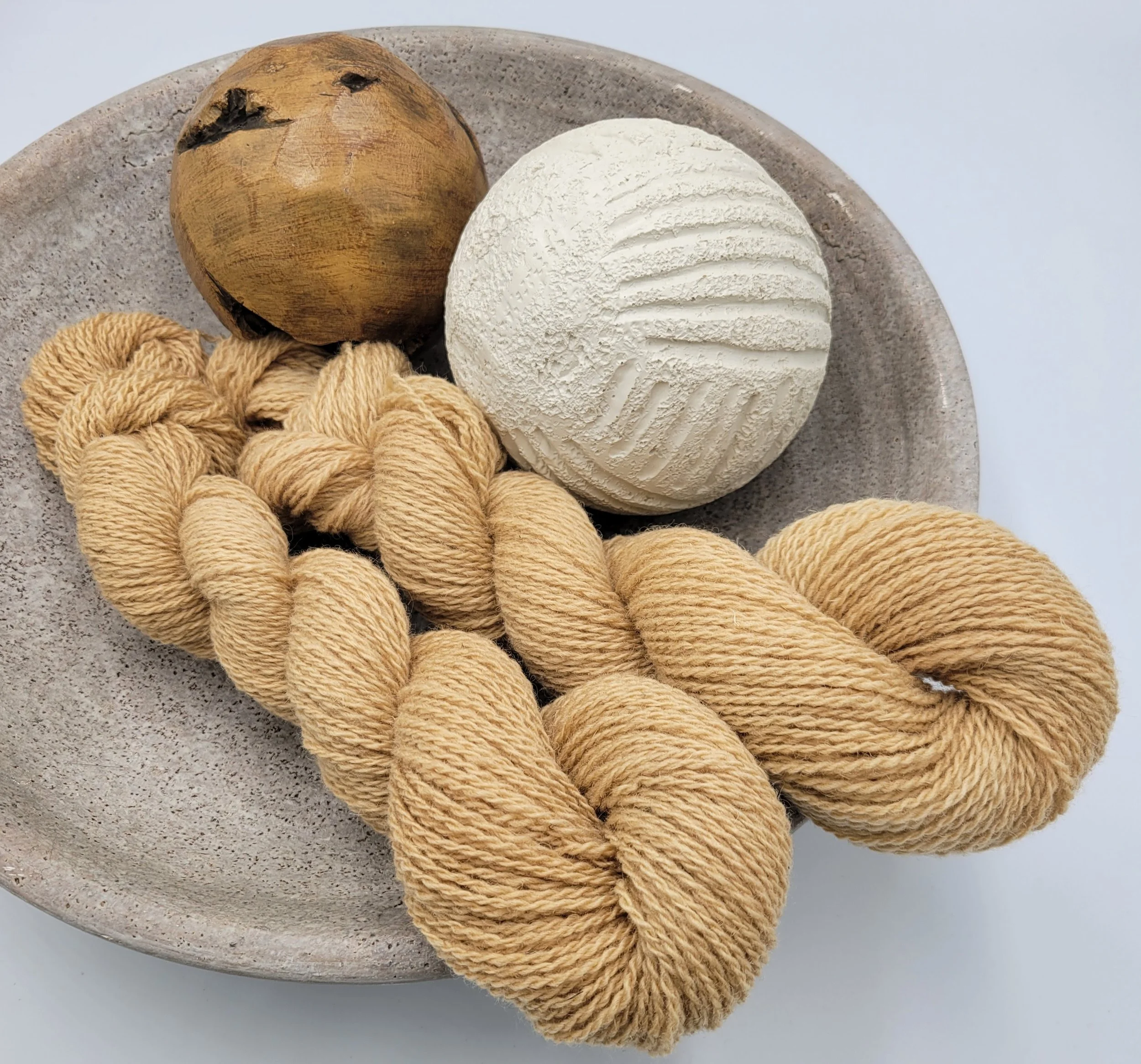 Once steeped, I filtered the dye into a dye pot, added two skeins of natural Eriu BFL/Romney, and gently heated the bath for about half an hour. I let it cool completely before removing the yarn and rinsing the excess dye. The resulting caramel colour is lighter than the solution but still very pretty. Knowing the base colour these lichens produce, it will be fun to mix them with other natural dyes and modifiers in the future to explore more potential colours.