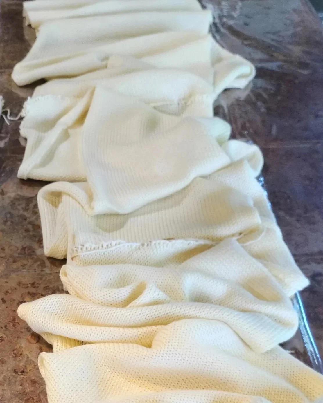 My youngest’s favourite colour is enduringly brown. A few years ago, I invited her to choose a knitting pattern and a colour. She chose a gorgeous leaf motif shawl with long matching gloves in the colour, you guessed it, brown. But not just any brown. Rowan wanted a particular shade and she wanted a fade. I thought on this for a bit. I couldn’t guarantee an even fade if I dyed separated skeins of yarn in varying depths of shade. There would be an obvious transition when I changed skeins, even if I alternated those skeins for a a few rows. The solution seemed to be sock blanks. Sock blanks are knit rectangles of fabric available as single or doubled yarns, the latter for making two identical skeins at once. You can unravel them into balls or knit right from the blanks. Singles would do for this project and I needed three of them for the shawl. So, I unraveled a bit of the yarn and used it to temporarily and loosely sew three blanks together. This extended length of fabric would hopefully become the fade we envisioned for the shawl and a separate skein would do for the gloves.