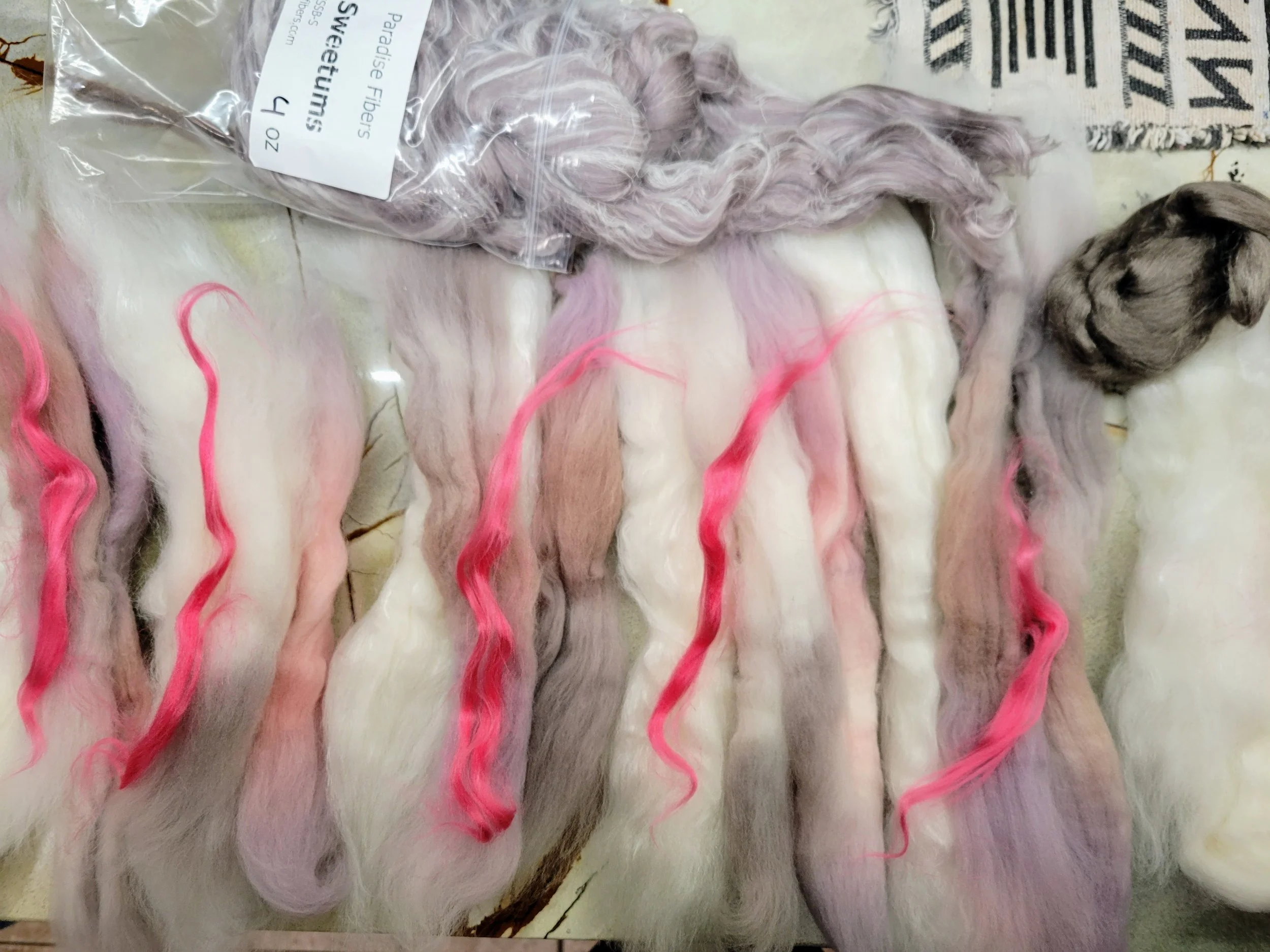 Opening up Hug and a Mug and laying out the pattern repeats, I felt a need to contrast these colours a bit more yet make them even softer and to try to preserve that subtle stripe, like a soft rythmic hum. The fiber was targhee so I measured out an equal weight, 100g, of undyed Ashland Bay Targhee sock (targhee, bamboo, tussah). I grabbed a touch of brown peduncle silk, bright pink bamboo, and grey and white Paradise Fibers Sweetums (mulberry silk, flax, merino) and took these bundles to the blending board.