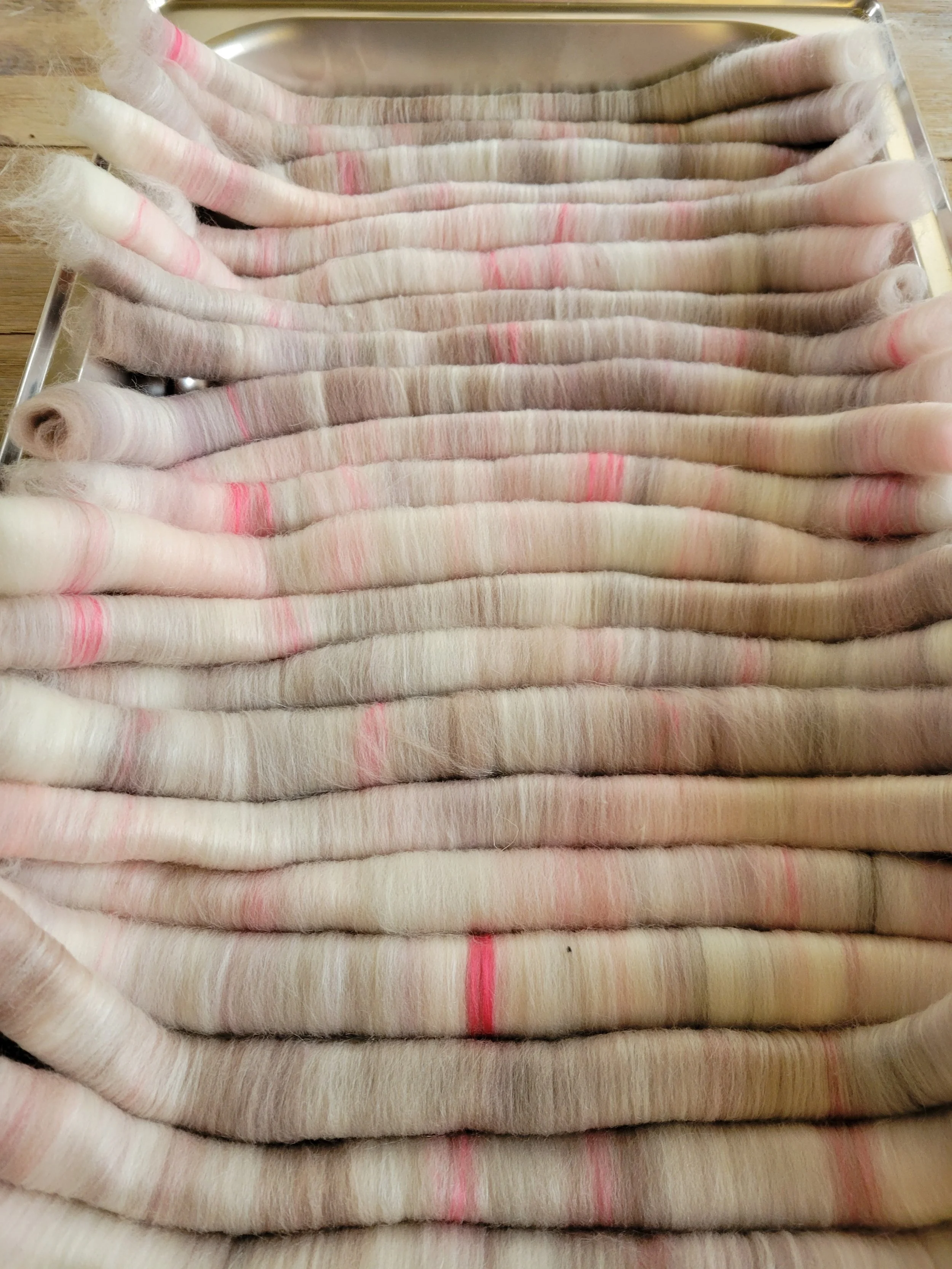 I split my fiber piles in half for a 2-ply, distributing the undyed targhee and a touch of Sweetums evenly throughout both piles. To the lighter strips, I added that bright pink silk. To the darker, hot cocoa bits, I added brown peduncle. Laying a brown-dominant pile on the blending board, I made 3 rolags at a time. I repeated with three rolags of pink-dominant fiber. I alternated back and forth between these two, laying the rolags in order for spinning. This process was repeated with the second half of the fiber.