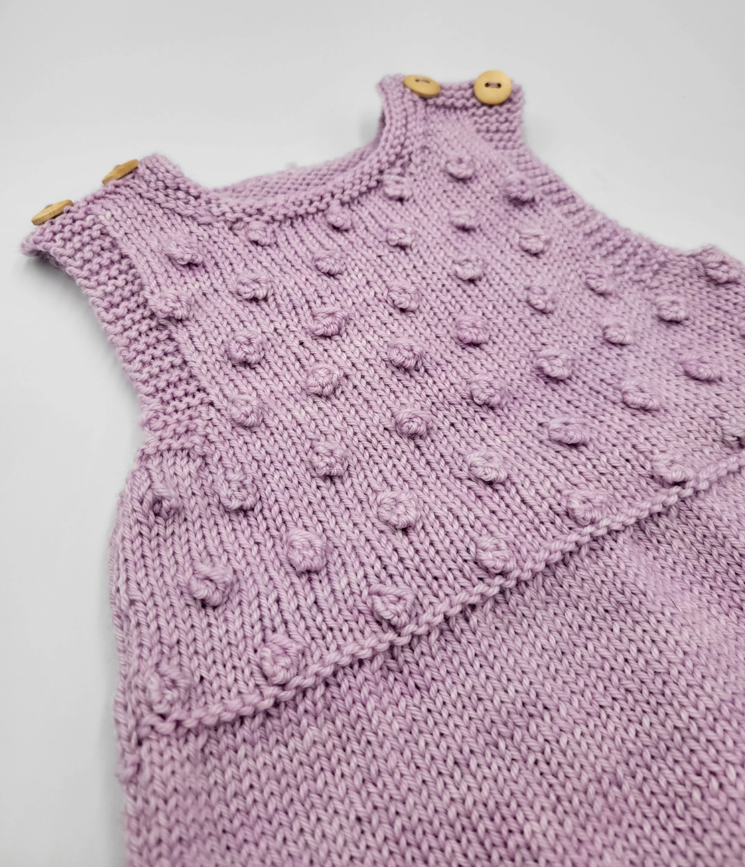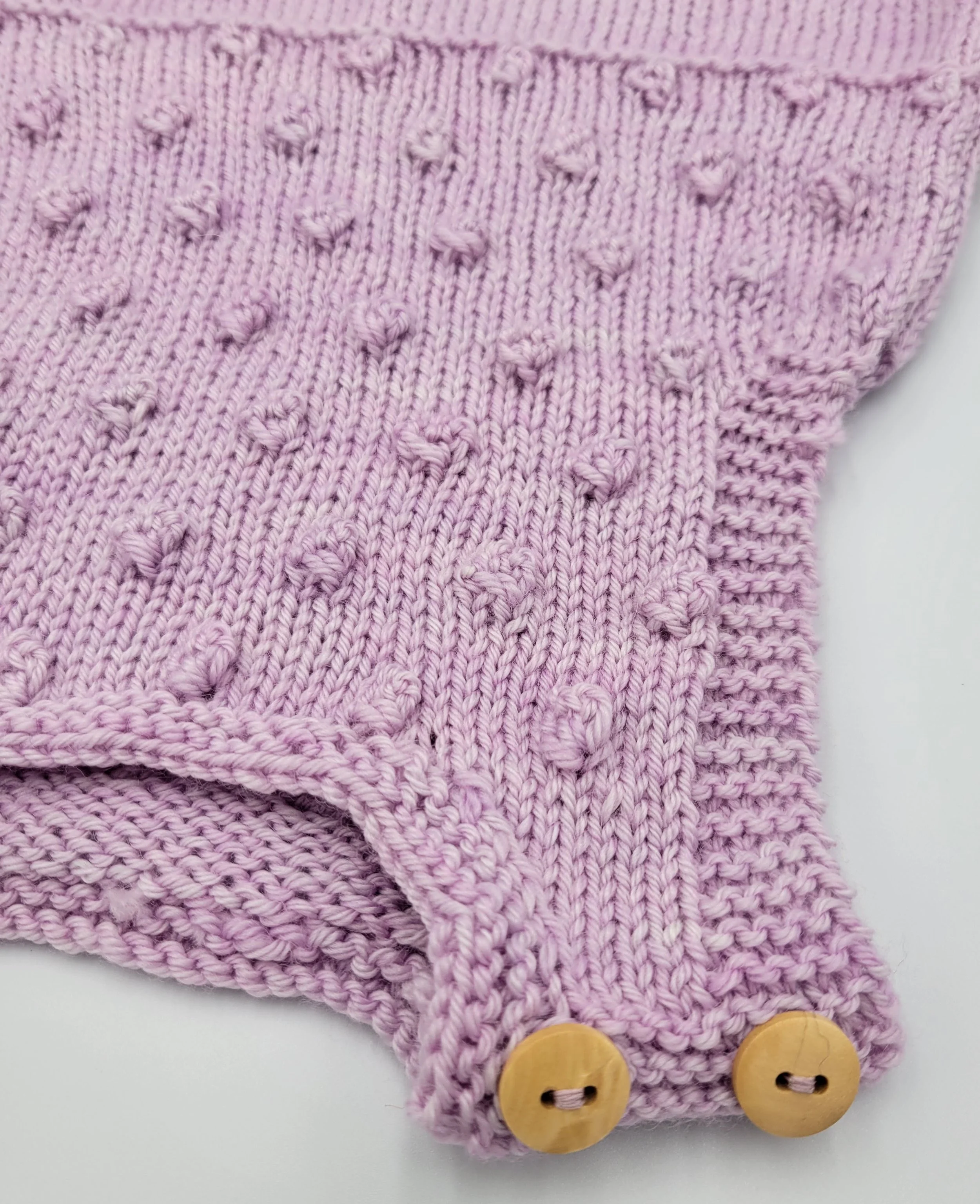 The Poppy Romper by Pippy Eve is adorable with its bobbles on front and back and extra diaper room. I knit this up in Lavender Bubble Bath, Unlike the Pink Romper this one has picked up stitches only along the neckline, making it a quicker, easier knit.